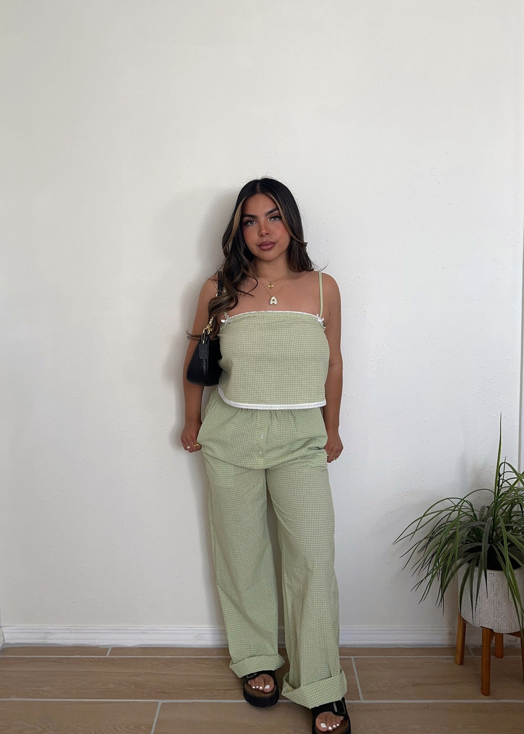Our MEADOW SET is a two piece blue & yellow gingham set with a baby doll top and straight leg bottom